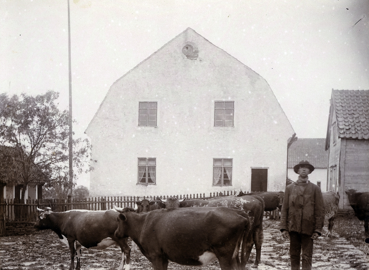 Man med nötkreatur på ladugårdsbacke i Halltorp på Öland.