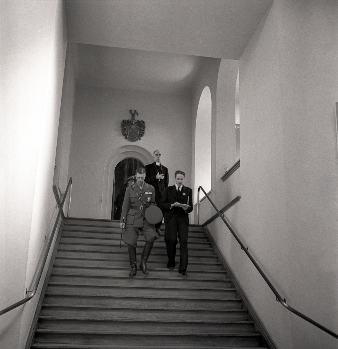 Kronprins Gustaf Adolf på väg nerför stora trappan i Smålands museum, tillsammans med landsantikvarie Jan Erik Anderbjörk. Bakom dem syns dåv.