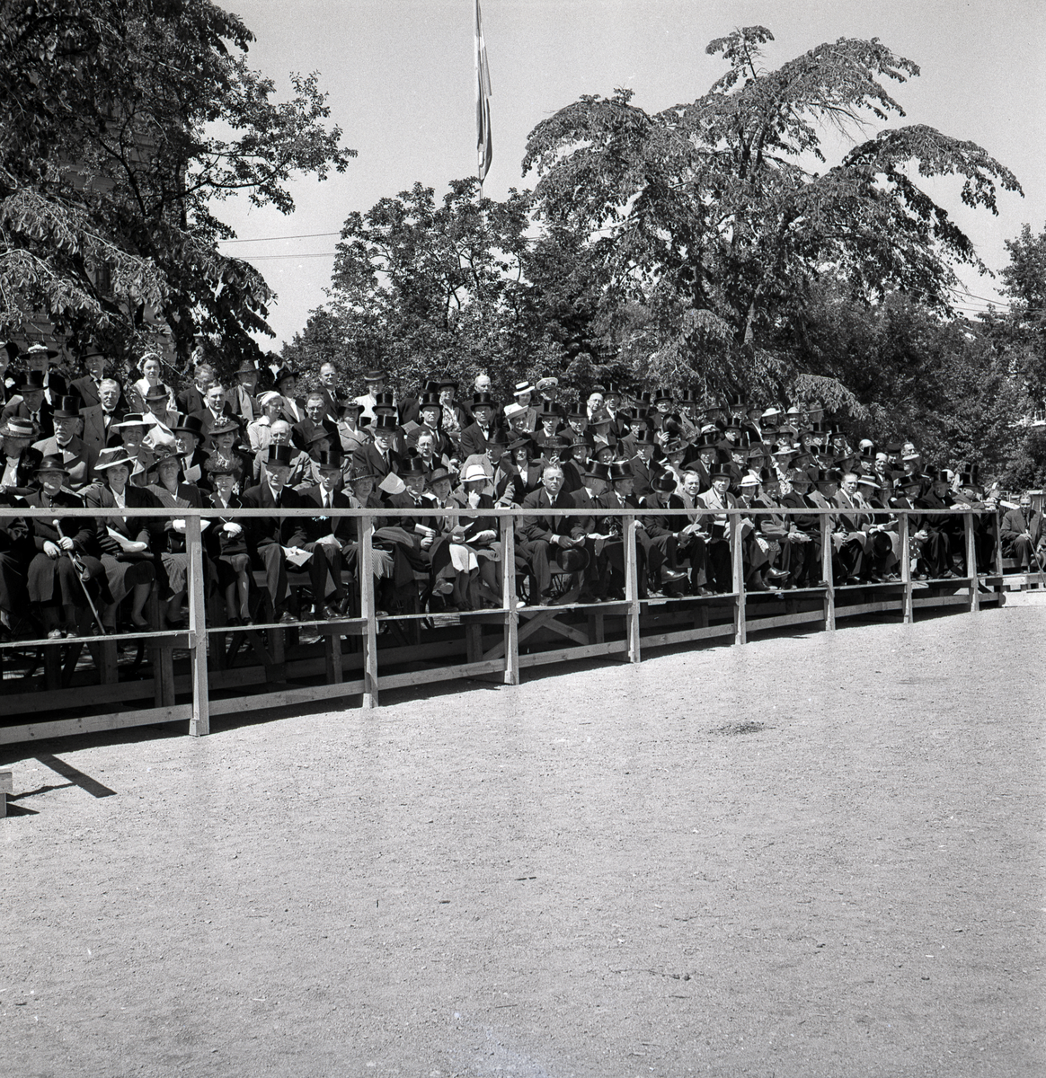 En del av invigningspubliken på en sidoläktare. Man ser många höga hattar m.m.