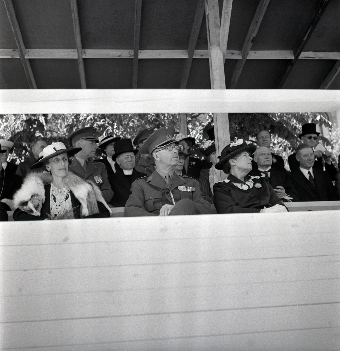 Jubileumsutställningen. Hedersgästerna på hedersläktaren. Fr.v.: kronprinsessan Louise, kronprins Gustaf Adolf och landshövdingens fru, Ingegerd Beskow.