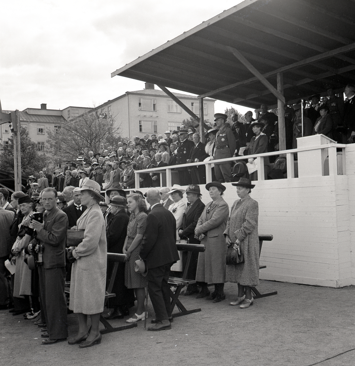 Hedersläktaren med hedersgästerna, bl a syns kronprinsparet Gustaf