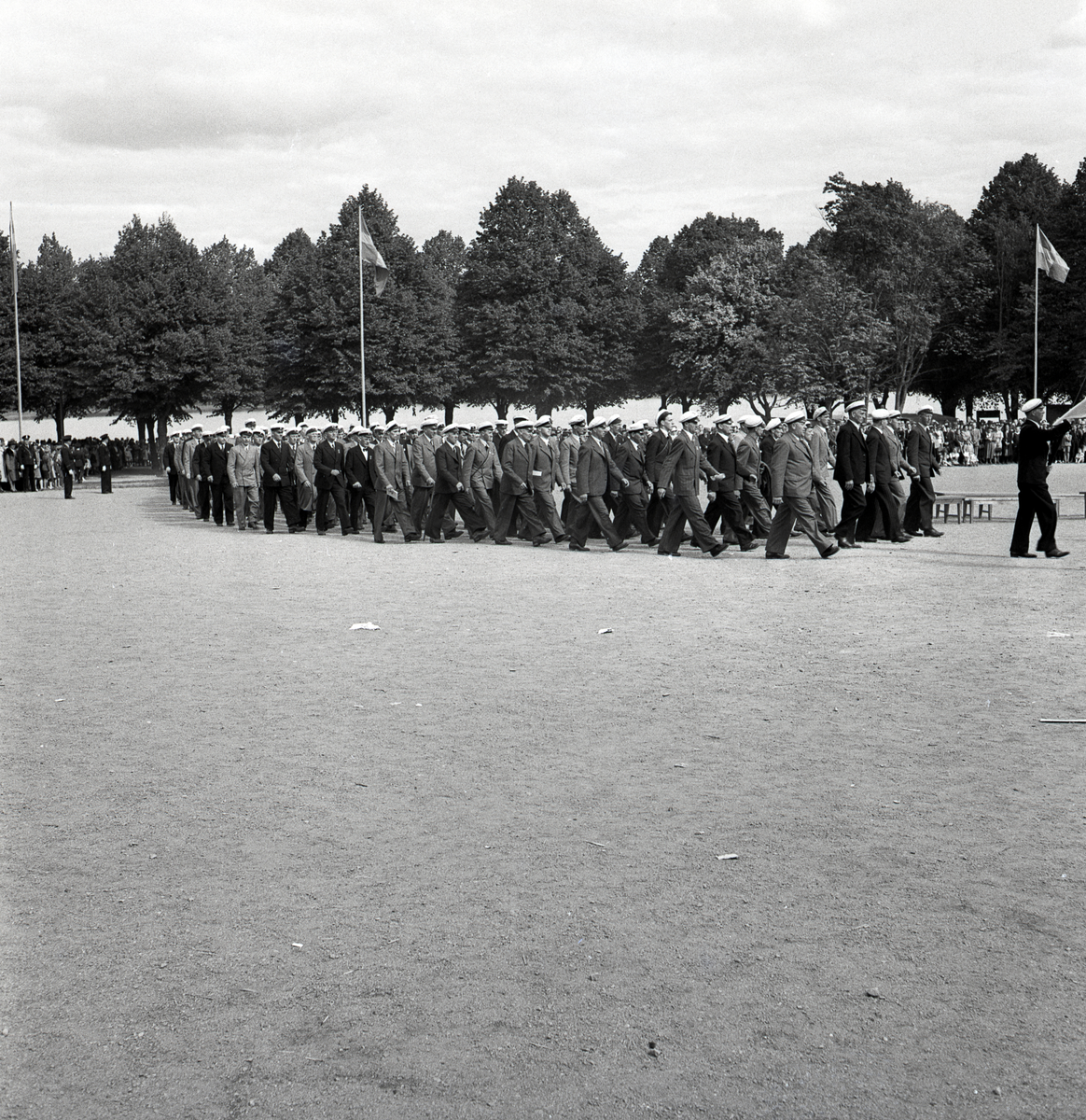 Fanborgen tågar in på planen framför Växjö Högre Allmänna Läroverk. Troligen Smålands sångarförbund.