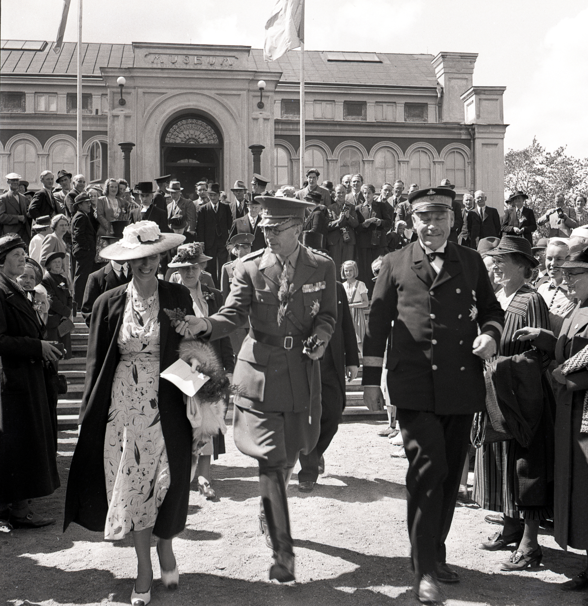 Kronprinsparet Gustaf Adolf och Louise har just lämnat Smålands museum och går igenom Museiparken tillsammans med landshövding August Beskow.