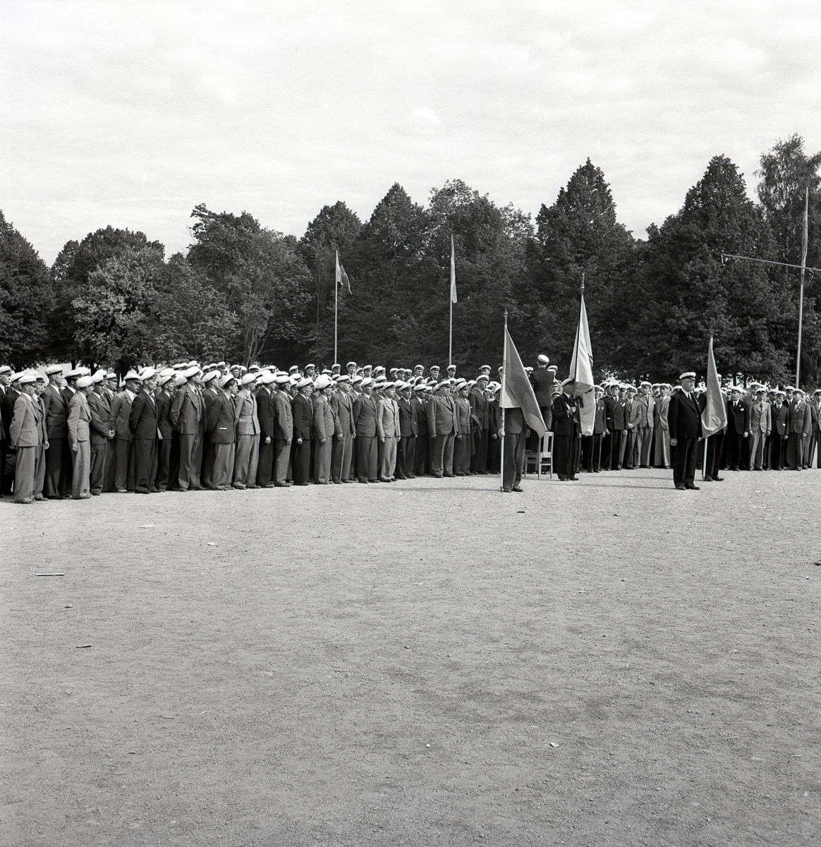 Sångarhyllning av en stor manskör i kostym och studentmössor (sångarmössor ?). Smålands sångarförbund.