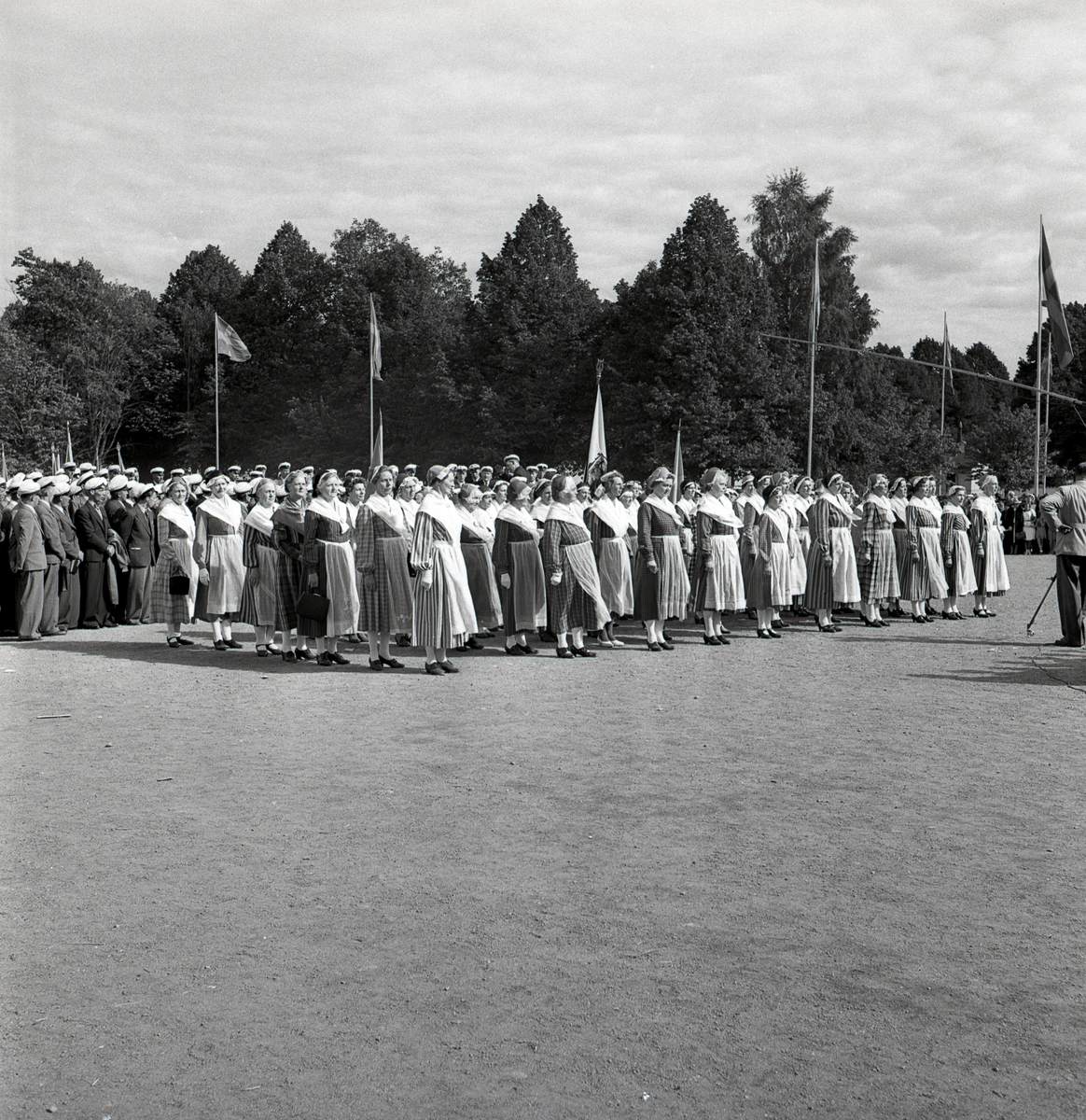 En stor samling kvinnor i s.k. husmorsdräkt har ställt upp sig på skolgården framför Växjö Högre Allmänna Läroverk. I bakgrunden syns en manskör.