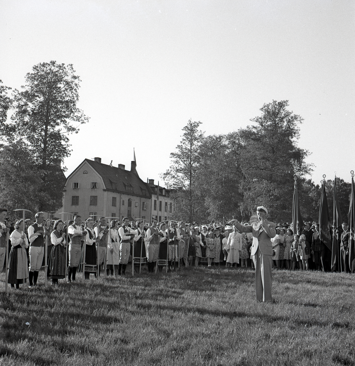 En man framför något på en äng, inramad av folk i värendsdräkt m.m.
