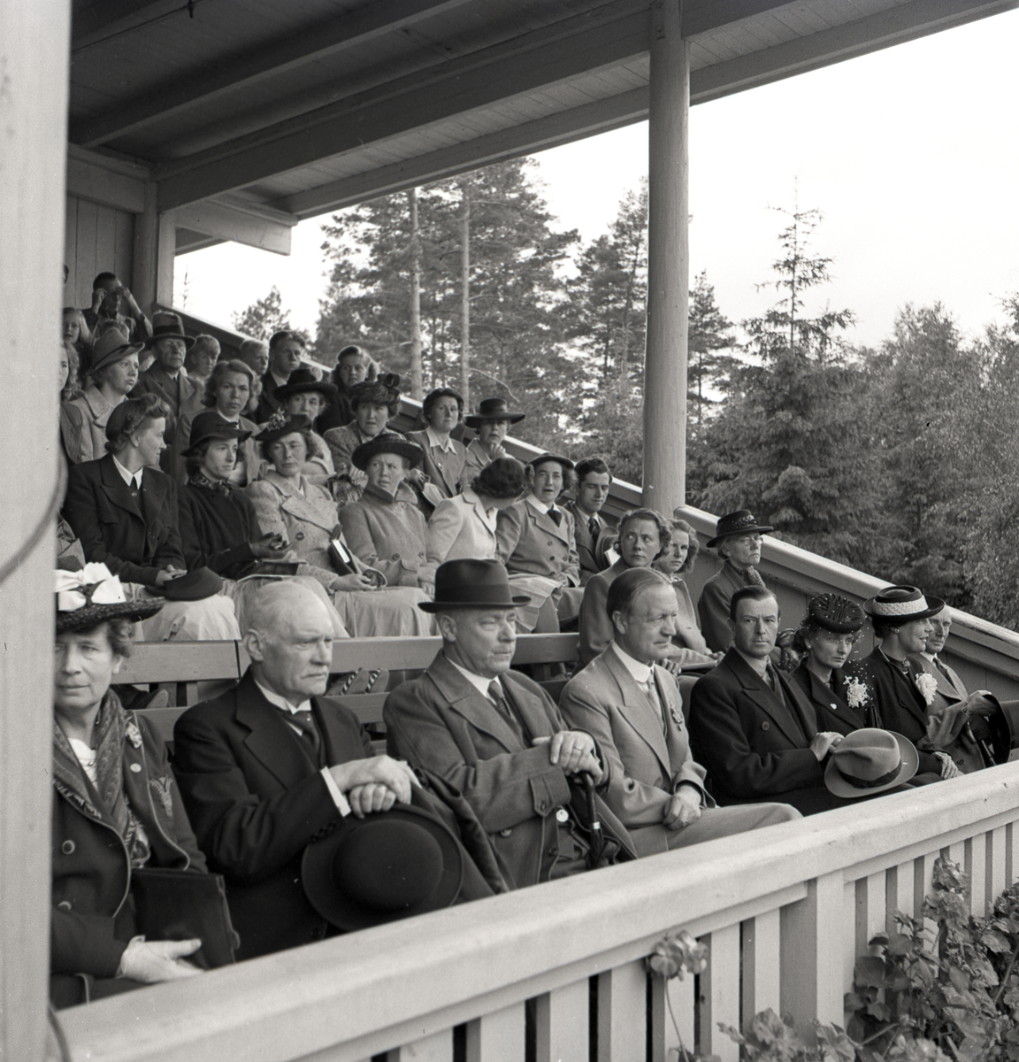 En del av hedersläktaren med inbjudna. Främst till höger syns landshövdingeparet August och Ingegerd Beskow med en okänd, äldre herre mellan sig. Gymnastikens dag.