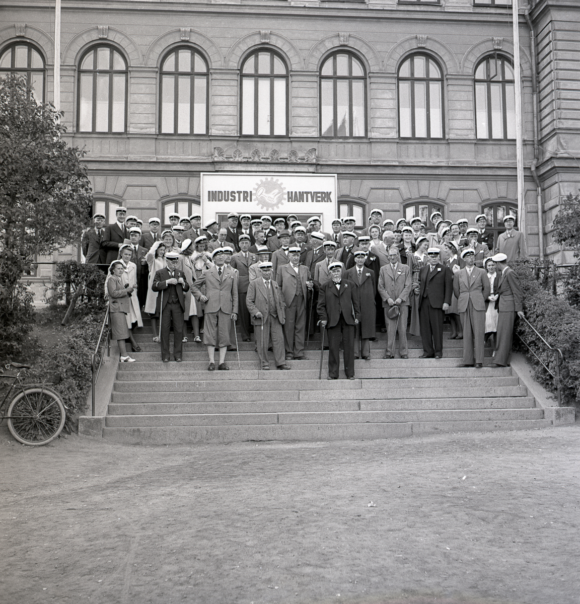 Växjöstudenternas dag. Flera f.d. studenter har samlats på trappan till dåv. Växjö Högre Allmänna Läroverk.