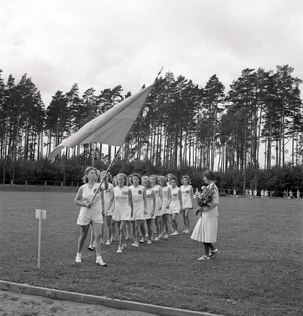 med en blombukett till höger. Gymnastikens dag.