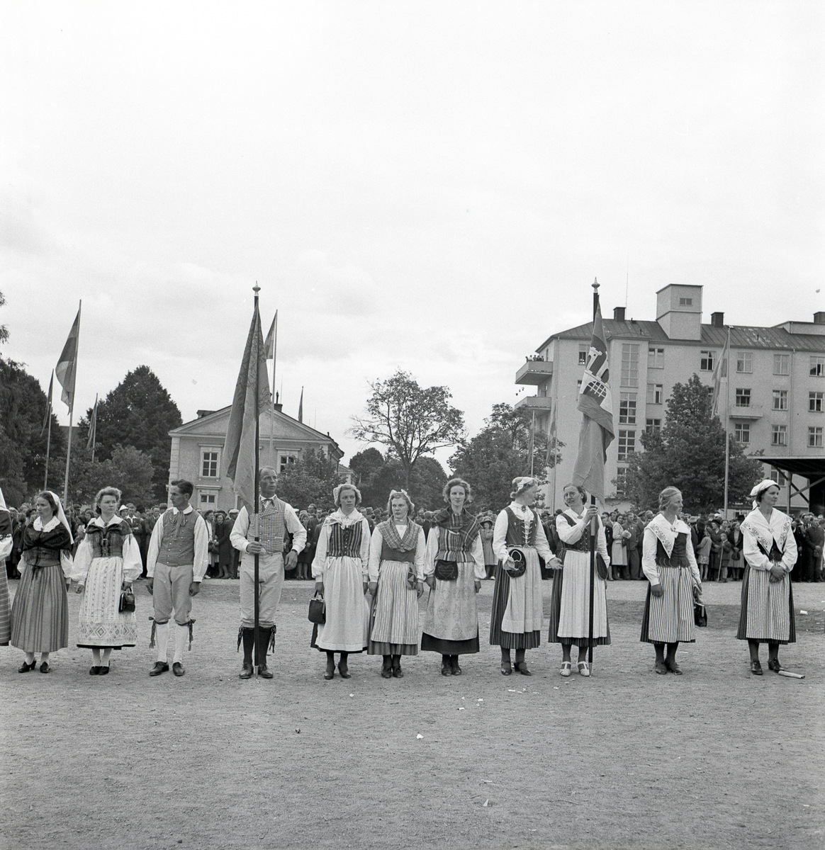 Kvinnor och män i olika folkdräkter. I bakgrunden syns en del av