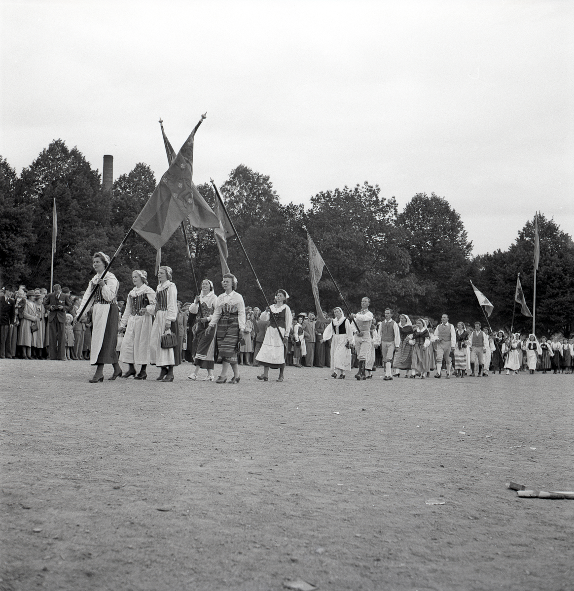 En fanborg med människor i olika folkdräkter tågar in på skolgården