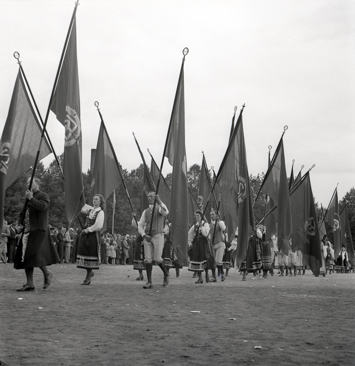 En fanborg med människor i olika folkdräkter tågar in på skolgården