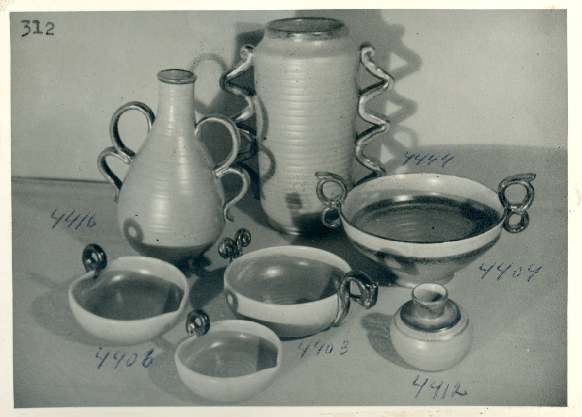 Vaser, skålar och ljusstake/vas från Bo Fajans, formgivare Eva Jancke-Björk, 1900-talets mitt.
