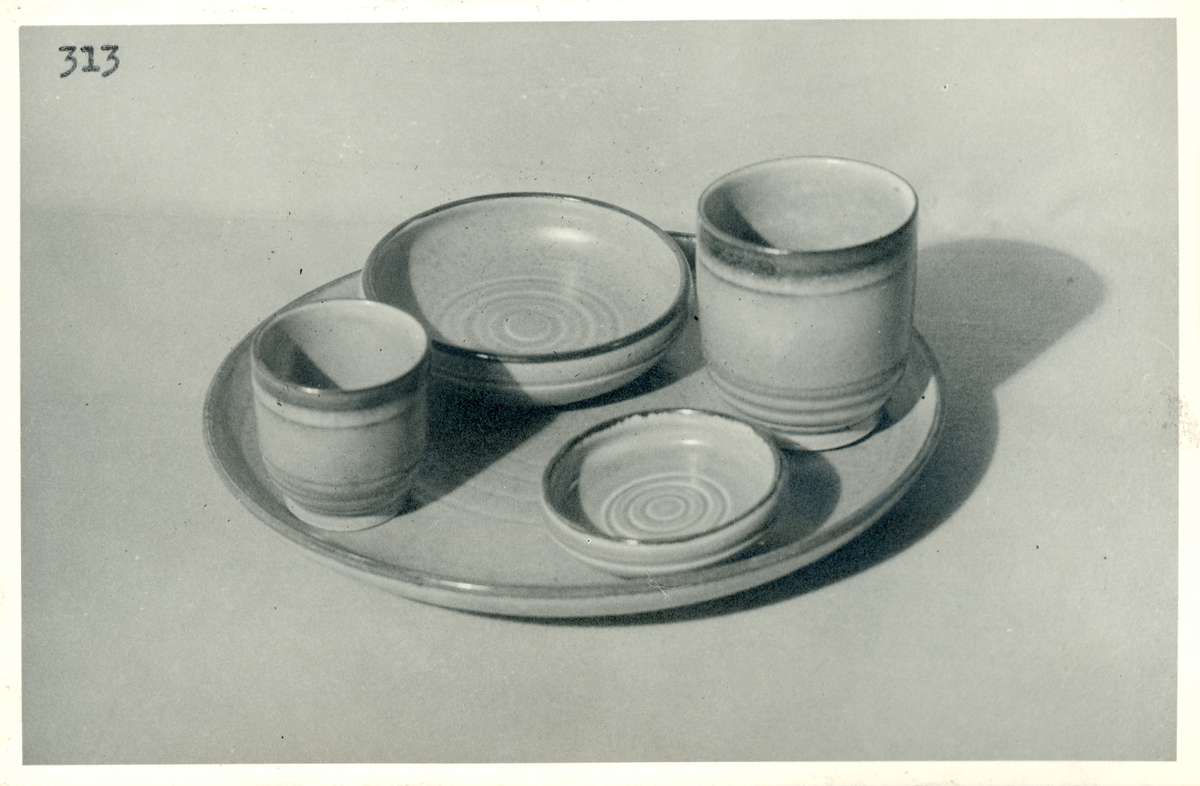 Rökbordsuppsats med bägare, askfat och bricka från Bo Fajans, formgivare Eva Jancke-Björk, 1900-talets mitt.