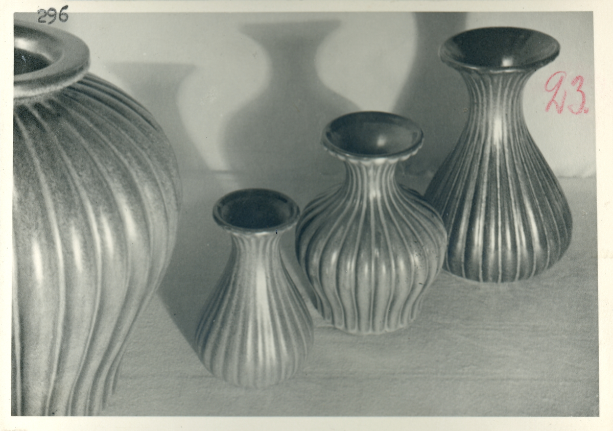 Urna och mindre vaser i dekor Granit från Bo Fajans, formgivare Ewald Dahlskog, 1900-talets mitt.