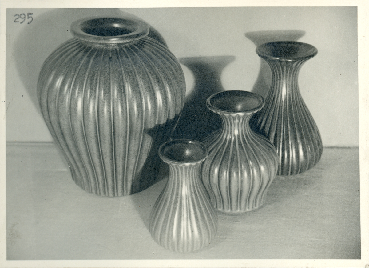 Urna och mindre vaser i dekor Granit från Bo Fajans, formgivare Ewald Dahlskog, 1900-talets mitt.