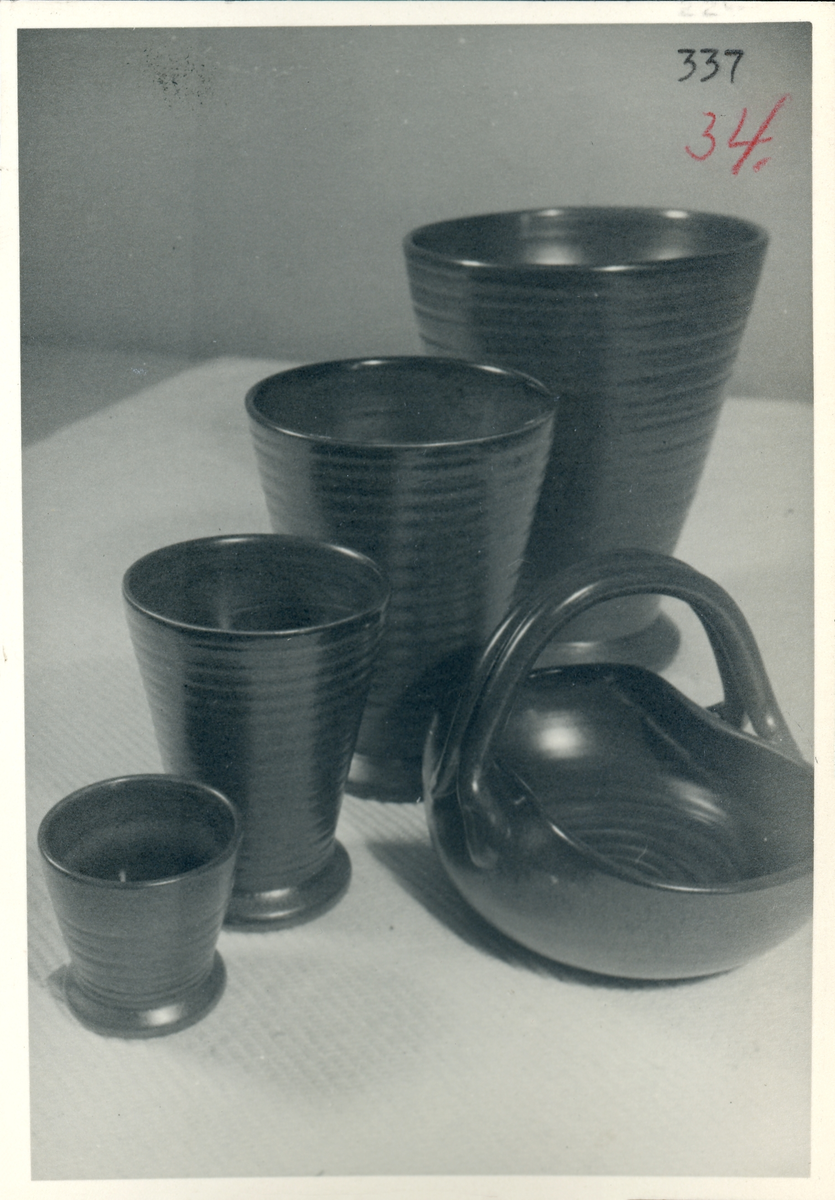 Blombägare och blomkrog i konstglasyr Ferro från Bo Fajans, formgivare Eva Jancke-Björk, 1900-talets mitt.