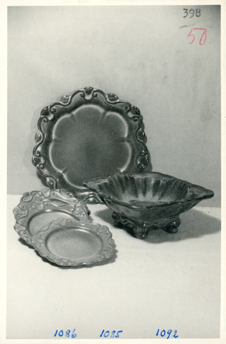 Assiett, tårtfat och fruktskål från Bo Fajans, formgivare Allan Ebeling, tidigt 1900-tal.