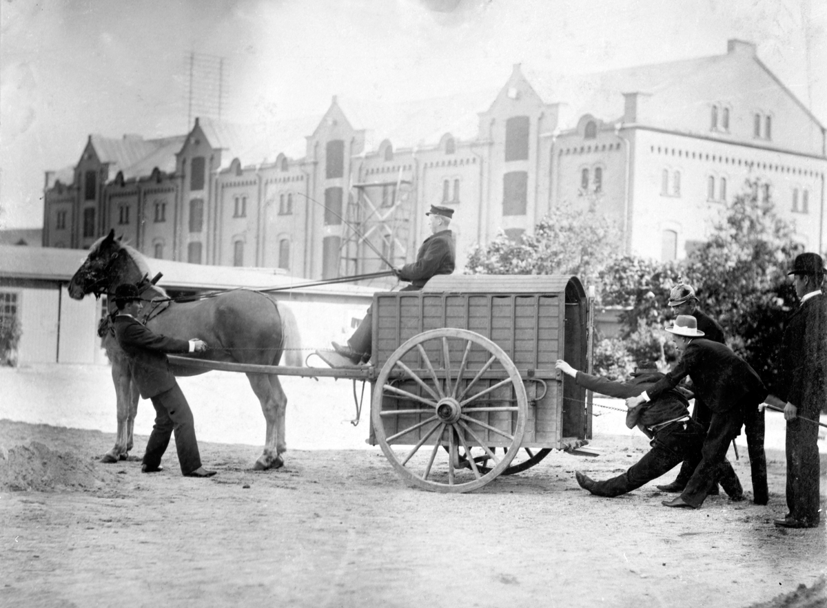 "Fyllkärra" i hamnområdet i Gävle, 1902. Mannen till vänster, vid hästen, heter Reinecke och blev sedermera brandchef i Gävle. Längst till höger, rak i ryggen och med käpp i handen, står en man vid namn Welander, som senare blev vice brandchef i Norrköping.