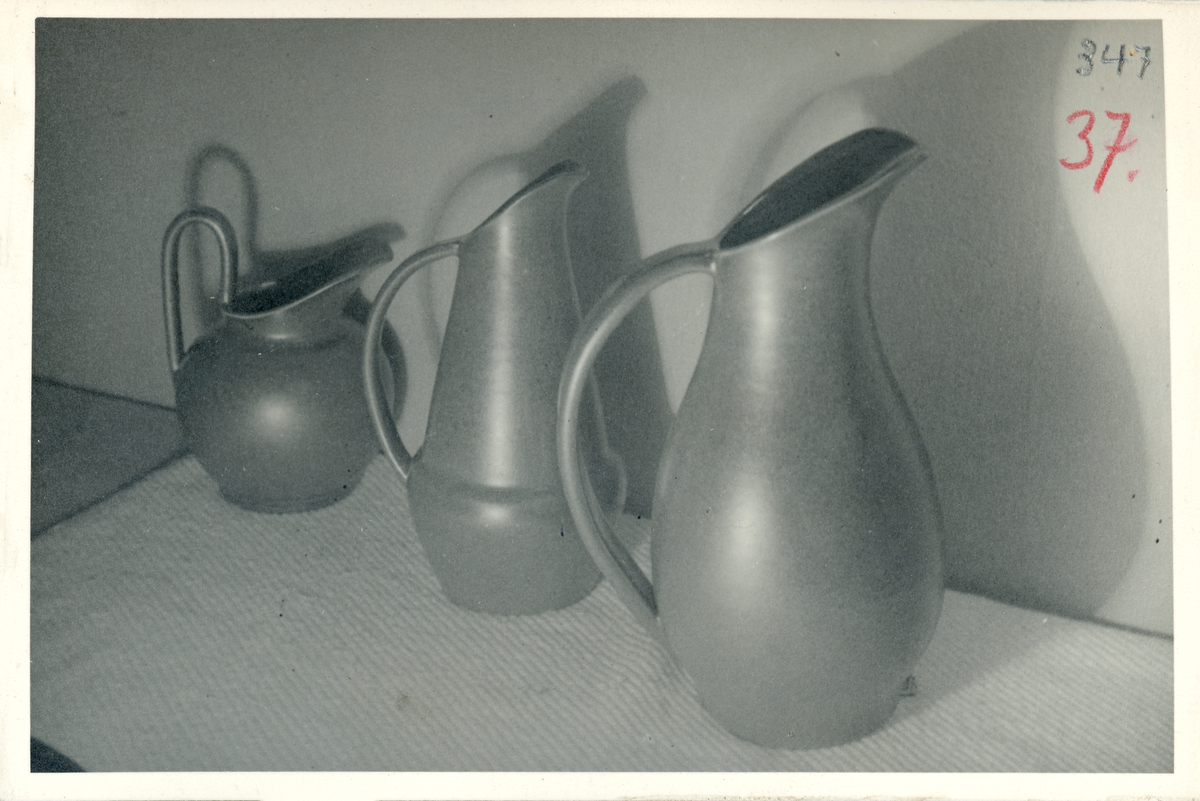 Kannor i konstglasyr Ferro från Bo Fajans, formgivare Ewald Dahlskog, 1900-talets mitt.