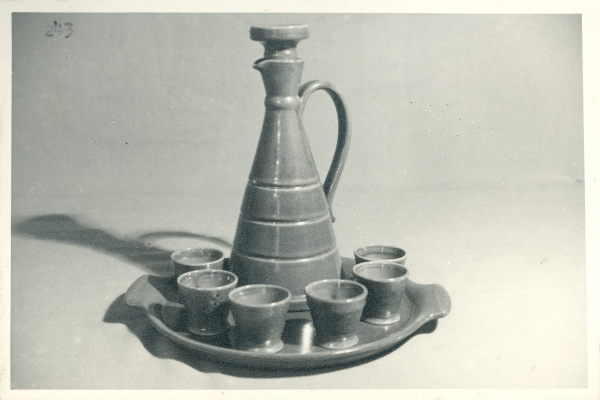 Likörservis med krus, bägare och bricka från Bo Fajans, formgivna av Eva Jancke-Björk samt Allan Ebeling, 1900-talets mitt.