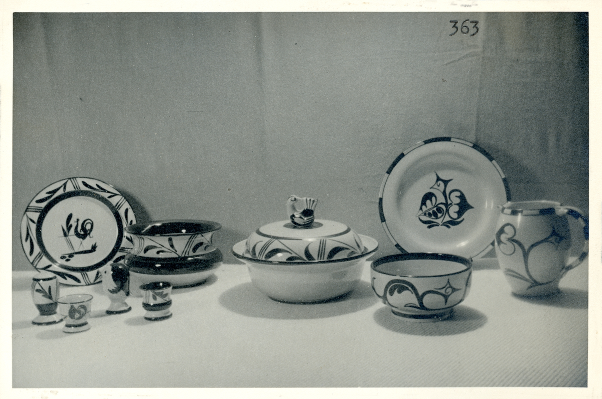 Påskservis i gul glasyr med inslag av växter och tuppar från Bo Fajans, formgivare Allan Ebeling, tidigt 1900-tal.