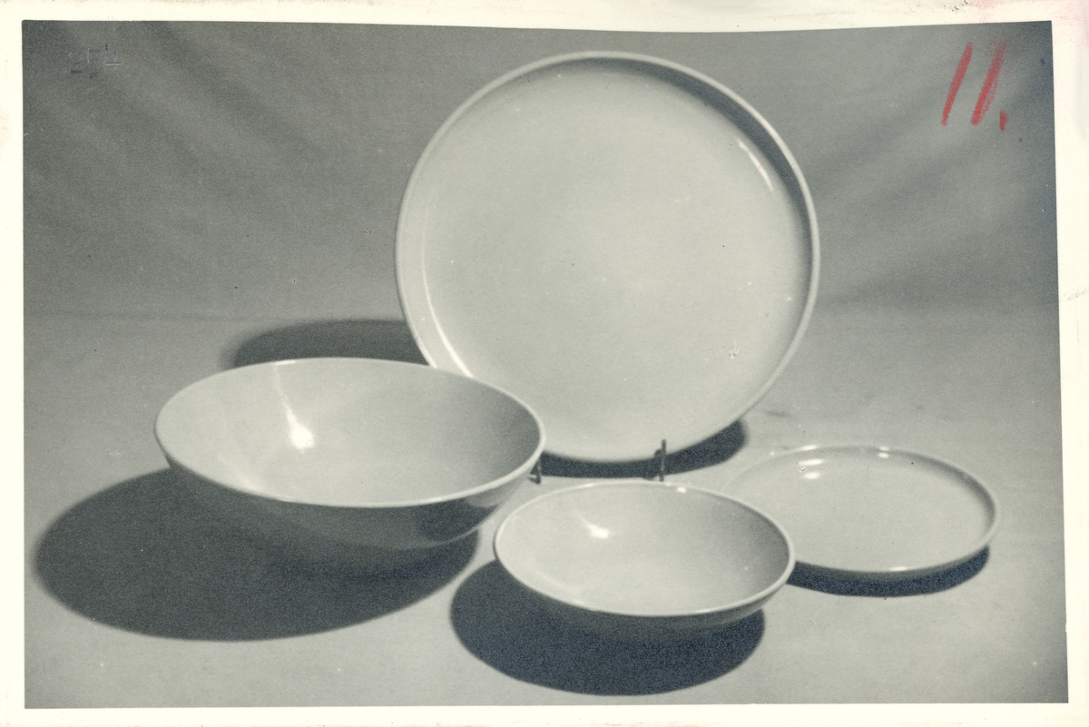 Skålar, fat och assiett från Bo Fajans, formgivare Maggie Wibom, 1900-talets mitt.