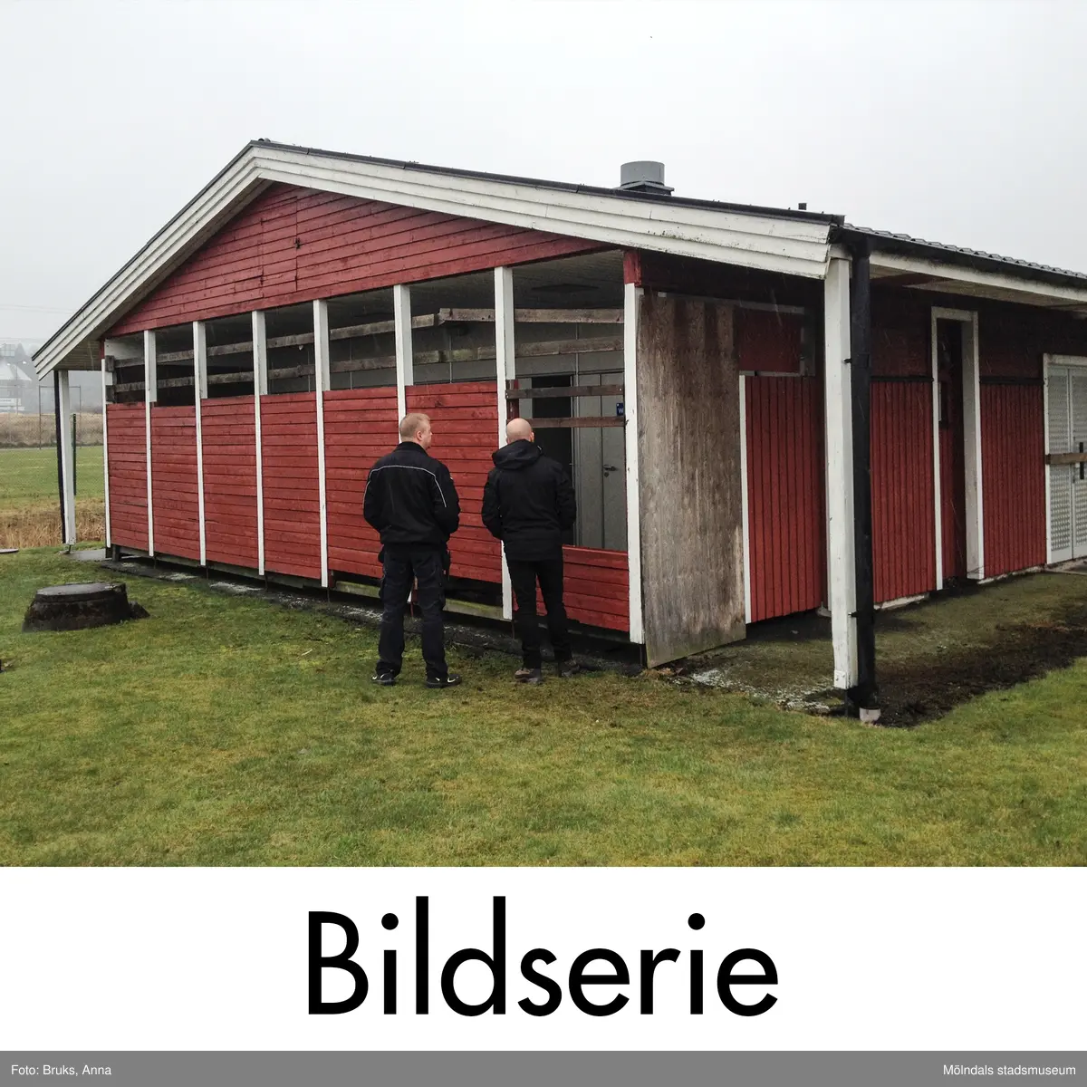 Serie om två fotografier som visar en rödmålad byggnad med fastighetsbeteckning Åby 1:84 vid Idrottsvägen i Åby, Mölndal. Fotografierna är tagna den 31 mars 2017. Byggnadsdokumentation inför rivning. Diarienummer: BN 0561/2018.