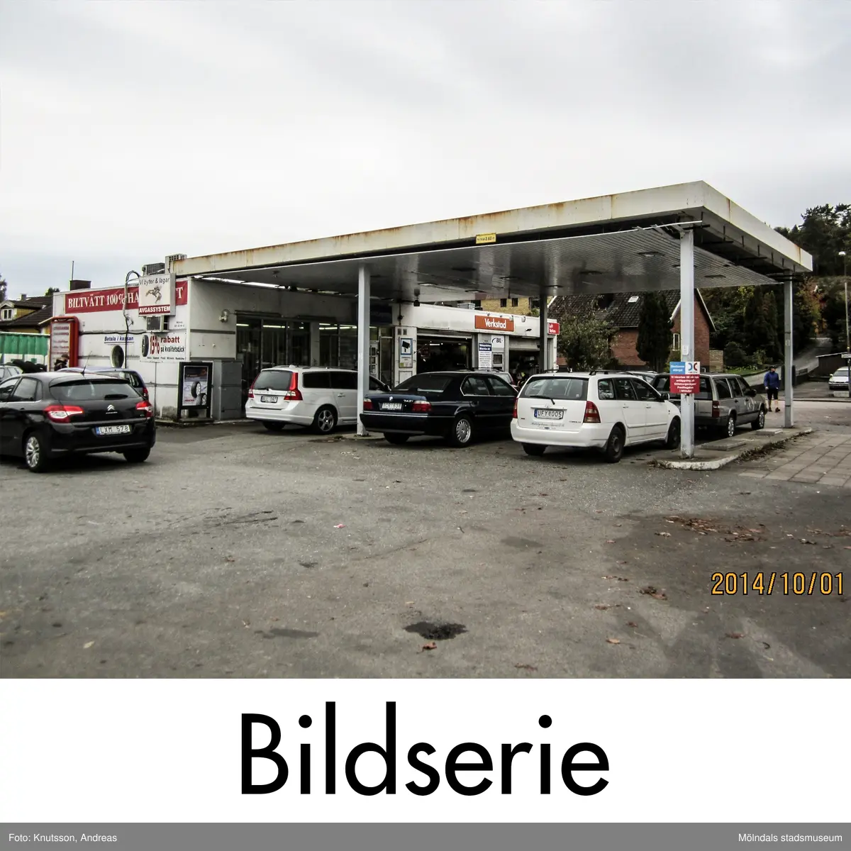 Serie om fyra fotografier som visar bensinstationen OKQ8 vid Toltorpsgatan 54 i Toltorpsdalen, Mölndal. Fotografier tagna den 1/10 2014. Byggnadsdokumentation inför rivning.