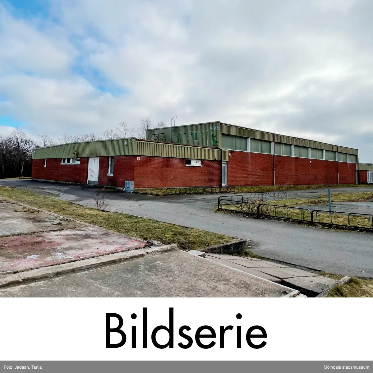 Serie om tre fotografier som visar exteriören av Ekhagaskolans idrottshall på fastigheten Växthuset 1 vid Stubbåkersgatan 1 i Fässberg, Mölndal. Skolan bar tidigare namnet Lindhagaskolan. Fotografierna är tagna 2021. Byggnadsdokumentation inför rivning.