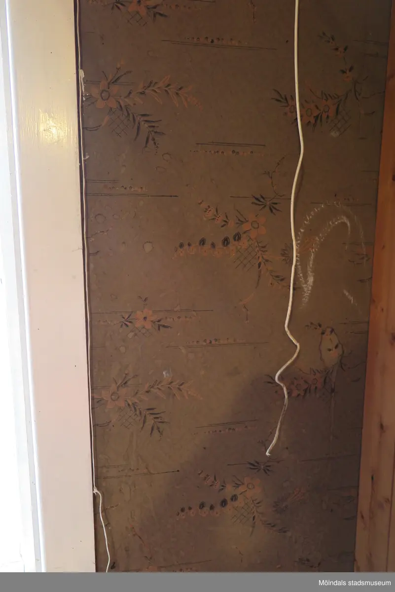 Del av innervägg med brunfärgad mönstrad tapet och två löst hängande vita kablar, Krokslättsgatan 18 i Mölndal 2023-06-21. Fotodokumentation av ett friliggande bostadshus/villa byggt 1932 med fyra (4) våningsplan. Byggnaden har tvättstuga i källaren samt torkvind på övervåningen. Boarea: 140 kvm, totalarea: 1004 kvm. Villan är ombyggd och fördelad på fyra (4) hyreslägenheter.