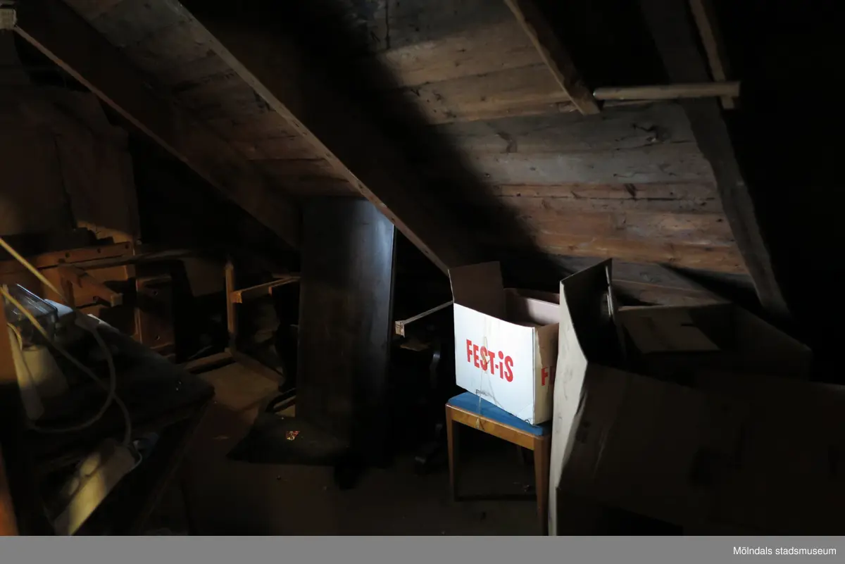 Ett vindsförråd med sneda takväggar fyllt med diverse saker, Krokslättsgatan 18 i Mölndal 2023-06-21. Fotodokumentation av ett friliggande bostadshus/villa byggt 1932 med fyra (4) våningsplan. Byggnaden har tvättstuga i källaren samt torkvind på övervåningen. Boarea: 140 kvm, totalarea: 1004 kvm. Villan är ombyggd och fördelad på fyra (4) hyreslägenheter.