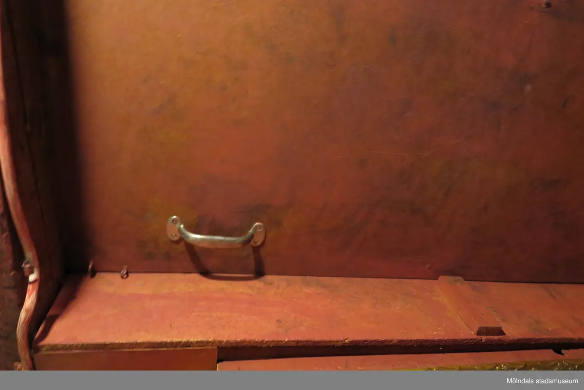 Detalj av handtag som sitter fast i en taklucka (se 2024_1439), Krokslättsgatan 18 i Mölndal 2023-06-21. Fotodokumentation av ett friliggande bostadshus/villa byggt 1932 med fyra (4) våningsplan. Byggnaden har tvättstuga i källaren samt torkvind på övervåningen. Boarea: 140 kvm, totalarea: 1004 kvm. Villan är ombyggd och fördelad på fyra (4) hyreslägenheter.