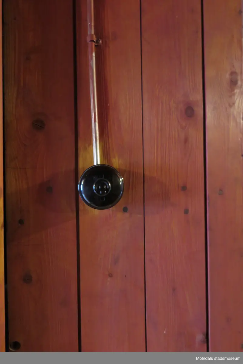 Del av brun/rödlaserad, panelsatt innervägg och en svart strömbrytare, Krokslättsgatan 18 i Mölndal 2023-06-21. Fotodokumentation av ett friliggande bostadshus/villa byggt 1932 med fyra (4) våningsplan. Byggnaden har tvättstuga i källaren samt torkvind på övervåningen. Boarea: 140 kvm, totalarea: 1004 kvm. Villan är ombyggd och fördelad på fyra (4) hyreslägenheter.