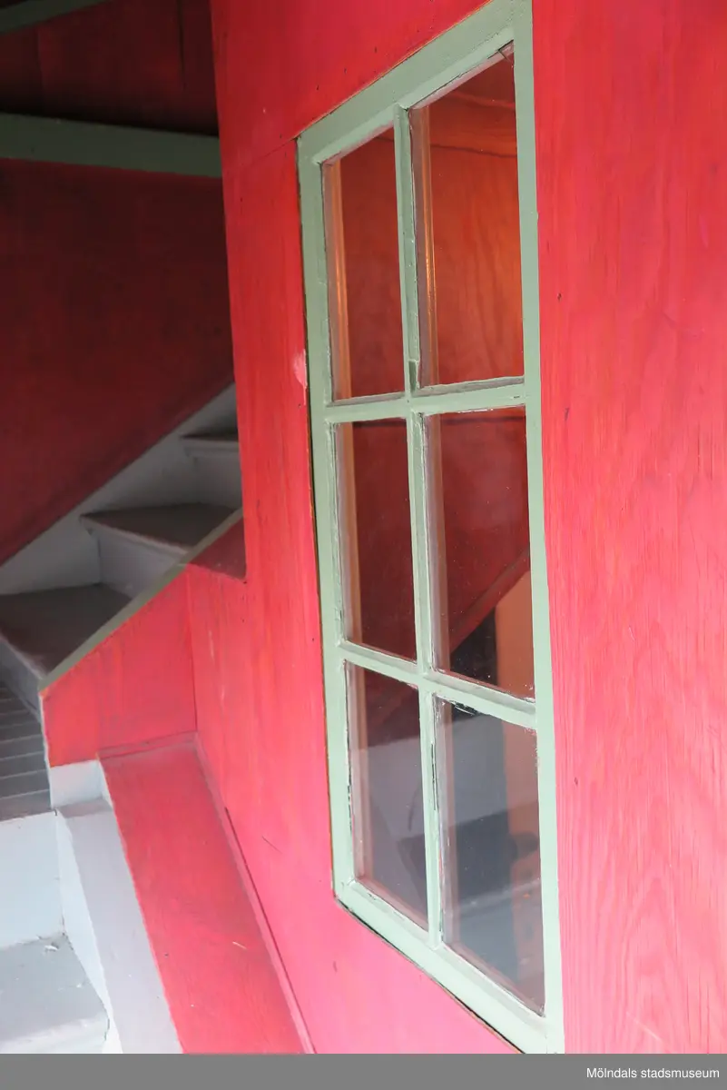 Ett grönt målat fönster inne i ett rött-/gråmålat trapphus, Krokslättsgatan 18 i Mölndal 2023-06-21. Fotodokumentation av ett friliggande bostadshus/villa byggt 1932 med fyra (4) våningsplan. Byggnaden har tvättstuga i källaren samt torkvind på övervåningen. Boarea: 140 kvm, totalarea: 1004 kvm. Villan är ombyggd och fördelad på fyra (4) hyreslägenheter.
