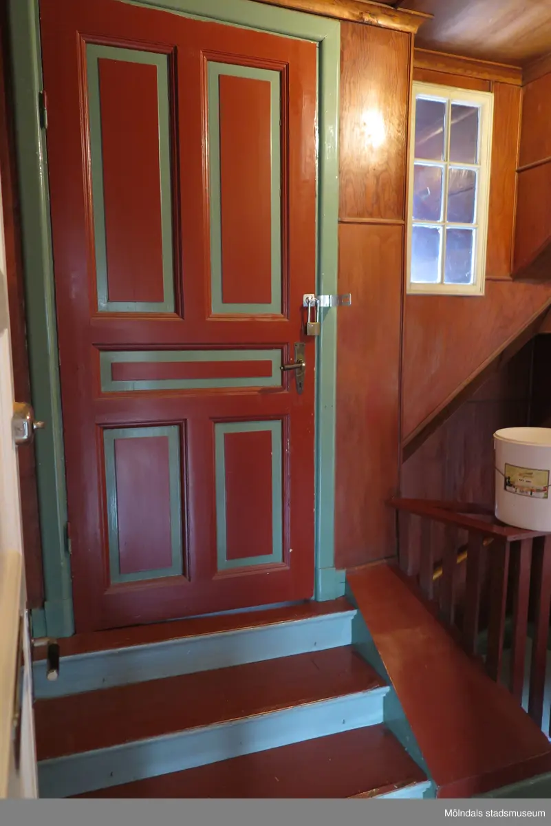 En röd/brun- och grönmålad dörr samt ett litet fönster inne i ett trapphus, Krokslättsgatan 18 i Mölndal 2023-06-21. Fotodokumentation av ett friliggande bostadshus/villa byggt 1932 med fyra (4) våningsplan. Byggnaden har tvättstuga i källaren samt torkvind på övervåningen. Boarea: 140 kvm, totalarea: 1004 kvm. Villan är ombyggd och fördelad på fyra (4) hyreslägenheter.