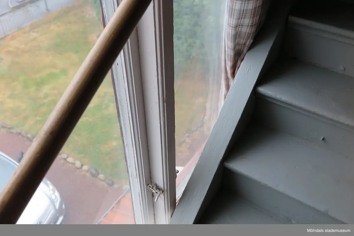 Vy från ett gråmålat trapphus ut genom ett fönster där en bil står parkerad nedanför, Krokslättsgatan 18 i Mölndal 2023-06-21. Fotodokumentation av ett friliggande bostadshus/villa byggt 1932 med fyra (4) våningsplan. Byggnaden har tvättstuga i källaren samt torkvind på övervåningen. Boarea: 140 kvm, totalarea: 1004 kvm. Villan är ombyggd och fördelad på fyra (4) hyreslägenheter.