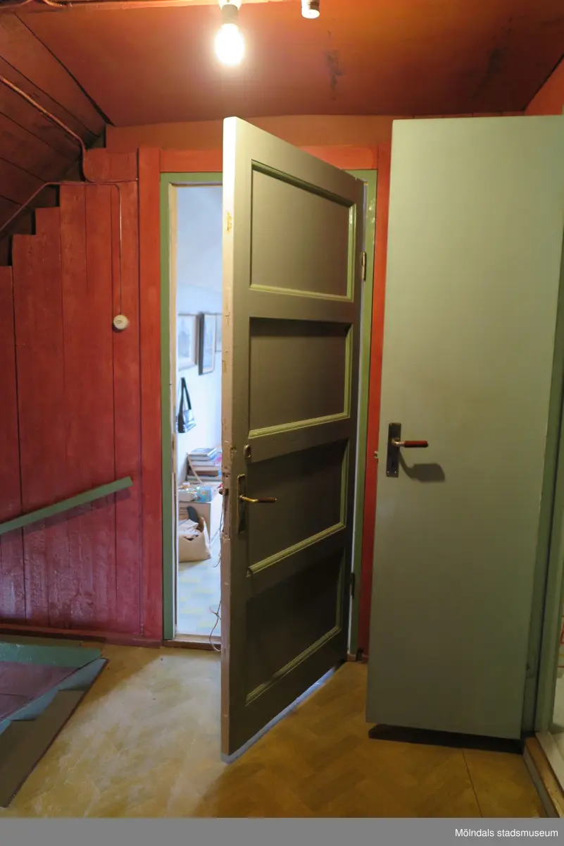 Två öppna ljusgröna dörrar i det brun/rödlaserade trapphuset på vindsvåningen (se 2024_1443), Krokslättsgatan 18 i Mölndal 2023-06-21. Fotodokumentation av ett friliggande bostadshus/villa byggt 1932 med fyra (4) våningsplan. Byggnaden har tvättstuga i källaren samt torkvind på övervåningen. Boarea: 140 kvm, totalarea: 1004 kvm. Villan är ombyggd och fördelad på fyra (4) hyreslägenheter.