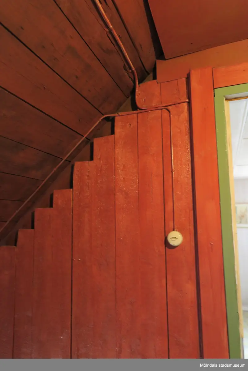Detalj av tak, vägg med strömbrytare och en ljusgrön dörrkarm i det brun/rödlaserade trapphuset på vindsvåningen, Krokslättsgatan 18 i Mölndal 2023-06-21. Fotodokumentation av ett friliggande bostadshus/villa byggt 1932 med fyra (4) våningsplan. Byggnaden har tvättstuga i källaren samt torkvind på övervåningen. Boarea: 140 kvm, totalarea: 1004 kvm. Villan är ombyggd och fördelad på fyra (4) hyreslägenheter.