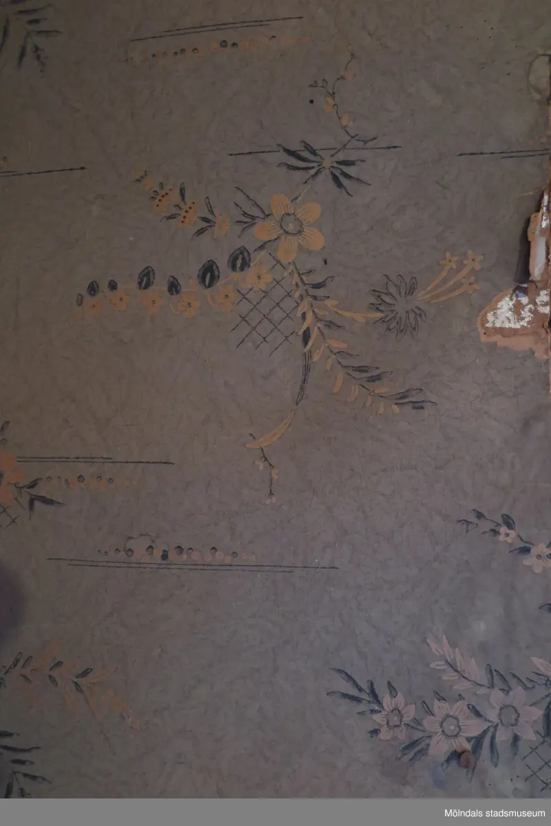Del av yttervägg, klädd med en mönstrad brunfärgad tapet (se 2024_1433), Krokslättsgatan 18 i Mölndal 2023-06-21. Fotodokumentation av ett friliggande bostadshus/villa byggt 1932 med fyra (4) våningsplan. Byggnaden har tvättstuga i källaren samt torkvind på övervåningen. Boarea: 140 kvm, totalarea: 1004 kvm. Villan är ombyggd och fördelad på fyra (4) hyreslägenheter.