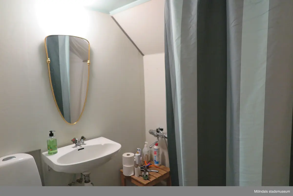 Ett litet toalettutrymme med toastol, handfat, spegel, en träpall med toalettpapper och rengöringsmedel, en väggmonterad kran och duschdrapperi, Krokslättsgatan 18 i Mölndal 2023-06-21. Fotodokumentation av ett friliggande bostadshus/villa byggt 1932 med fyra (4) våningsplan. Byggnaden har tvättstuga i källaren samt torkvind på övervåningen. Boarea: 140 kvm, totalarea: 1004 kvm. Villan är ombyggd och fördelad på fyra (4) hyreslägenheter.