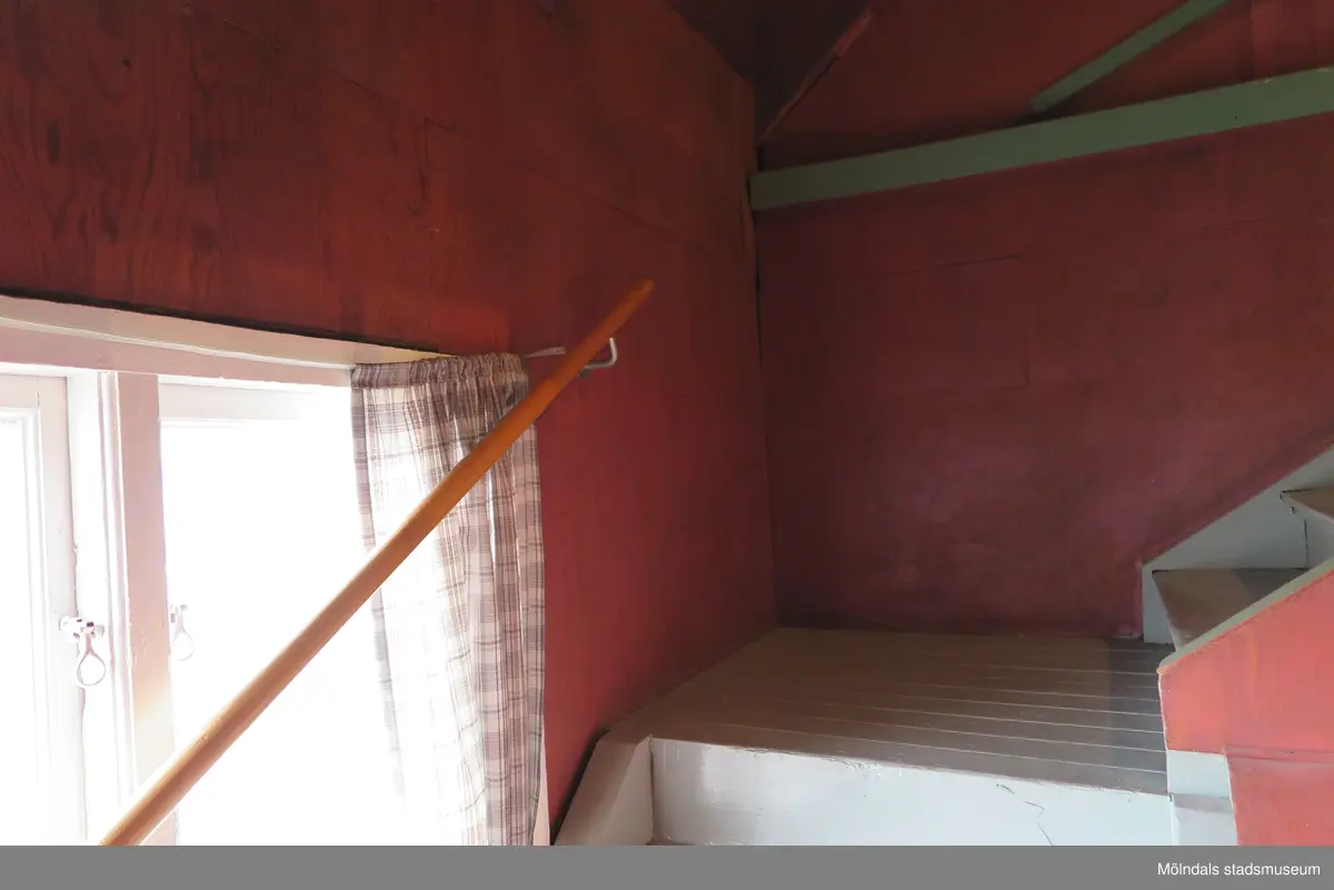 Vänster sida av den gråmålade trappan med de brun/rödlaserade väggarna fotograferad nerifrån och upp (se 2024_1452), Krokslättsgatan 18 i Mölndal 2023-06-21. Till vänster ses ett gardinförsett fönster och ledstång. Fotodokumentation av ett friliggande bostadshus/villa byggt 1932 med fyra (4) våningsplan. Byggnaden har tvättstuga i källaren samt torkvind på övervåningen. Boarea: 140 kvm, totalarea: 1004 kvm. Villan är ombyggd och fördelad på fyra (4) hyreslägenheter.
