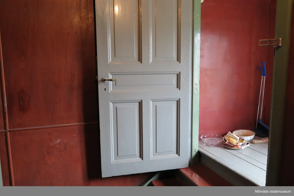 En gråmålad öppen dörr som leder ner till en trappa med brun/rödlaserade väggar (se 2024_1451), Krokslättsgatan 18 i Mölndal 2023-06-21. Utanför dörren står vattenskålar, tidningar, ett hundben och sopskyffel. Fotodokumentation av ett friliggande bostadshus/villa byggt 1932 med fyra (4) våningsplan. Byggnaden har tvättstuga i källaren samt torkvind på övervåningen. Boarea: 140 kvm, totalarea: 1004 kvm. Villan är ombyggd och fördelad på fyra (4) hyreslägenheter.