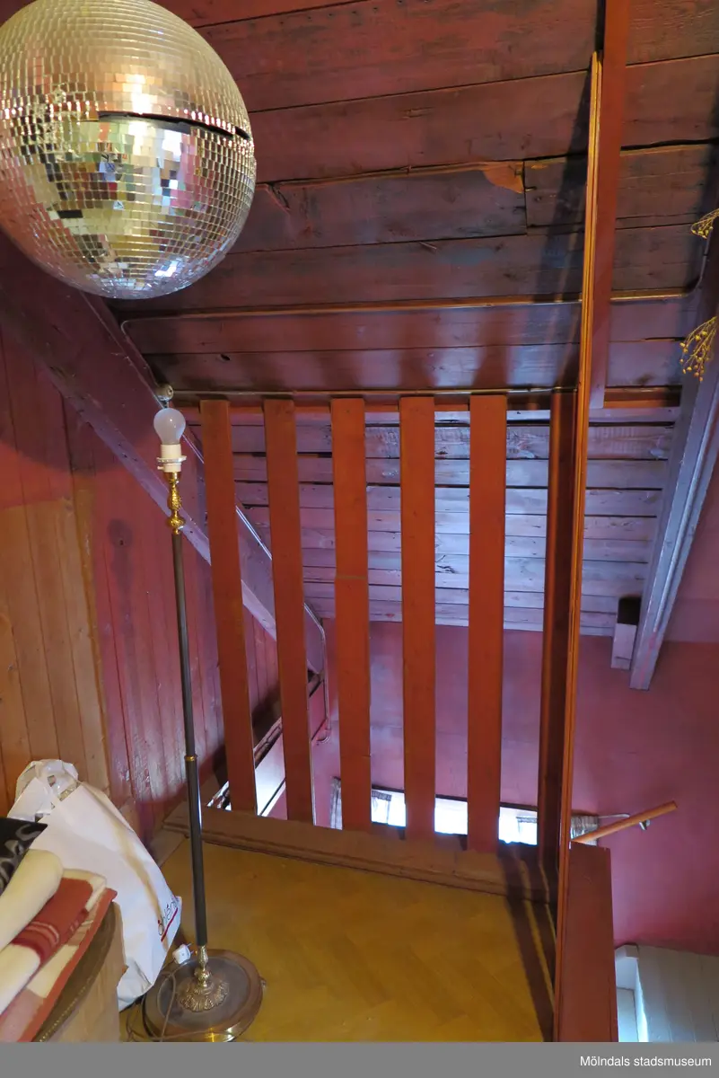 En discokula/spegelboll hänger i taket, en lampa står på golvet och ett rödmålat staket för att förhindra fall ses i det brun/rödlaserade trapphuset på vindsvåningen, Krokslättsgatan 18 i Mölndal 2023-06-21. Fotodokumentation av ett friliggande bostadshus/villa byggt 1932 med fyra (4) våningsplan. Byggnaden har tvättstuga i källaren samt torkvind på övervåningen. Boarea: 140 kvm, totalarea: 1004 kvm. Villan är ombyggd och fördelad på fyra (4) hyreslägenheter.