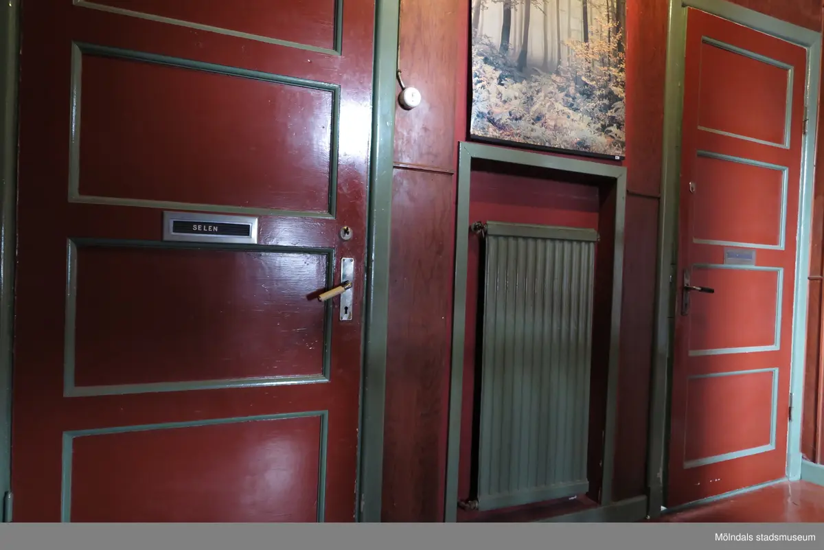 Närbild av 2024_1454. Ett våningsplan med brun/rödlaserade väggar samt två entrédörrar med var sitt brevinkast till lägenheter. Mellan dörrarna hänger ett element med en vintertavla ovanför, Krokslättsgatan 18 i Mölndal 2023-06-21. Fotodokumentation av ett friliggande bostadshus/villa byggt 1932 med fyra (4) våningsplan. Byggnaden har tvättstuga i källaren samt torkvind på övervåningen. Boarea: 140 kvm, totalarea: 1004 kvm. Villan är ombyggd och fördelad på fyra (4) hyreslägenheter.