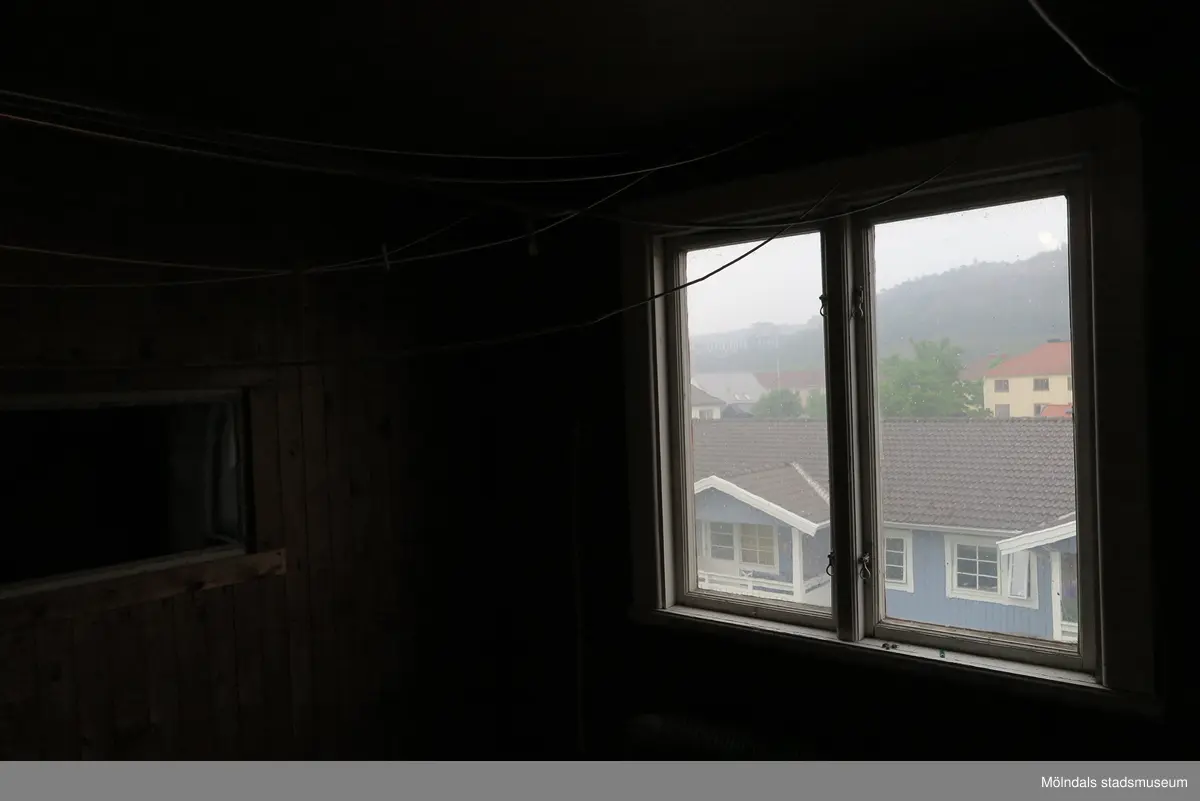 Del av ett rum och ett fönster (se 2024_1430), Krokslättsgatan 18 i Mölndal 2023-06-21. Genom fönstret ses lägenheter på Gärdegatan. I bakgrunden skymtar ett gult bostadshus på Krokslättsgatan samt Rallarberget. Fotodokumentation av ett friliggande bostadshus/villa byggt 1932 med fyra (4) våningsplan. Byggnaden har tvättstuga i källaren samt torkvind på övervåningen. Boarea: 140 kvm, totalarea: 1004 kvm. Villan är ombyggd och fördelad på fyra (4) hyreslägenheter.