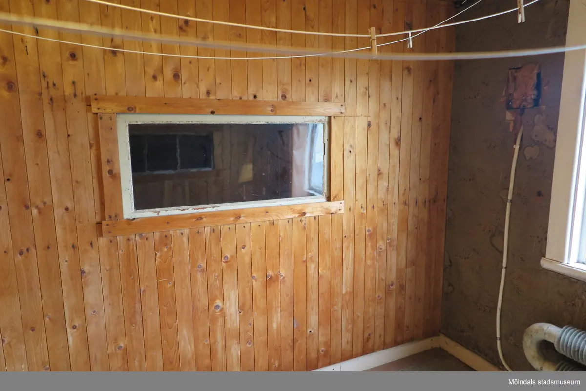 Del av ett rum med tvättlinor i taket, väggklädd träpanel (se 2024_1430, _1431) och ett avlångt inramat innefönster. Till höger skymtas en elkabel, ett fönster och en kamrörsradiator, Krokslättsgatan 18 i Mölndal 2023-06-21. Fotodokumentation av ett friliggande bostadshus/villa byggt 1932 med fyra (4) våningsplan. Byggnaden har tvättstuga i källaren samt torkvind på övervåningen. Boarea: 140 kvm, totalarea: 1004 kvm. Villan är ombyggd och fördelad på fyra (4) hyreslägenheter.
