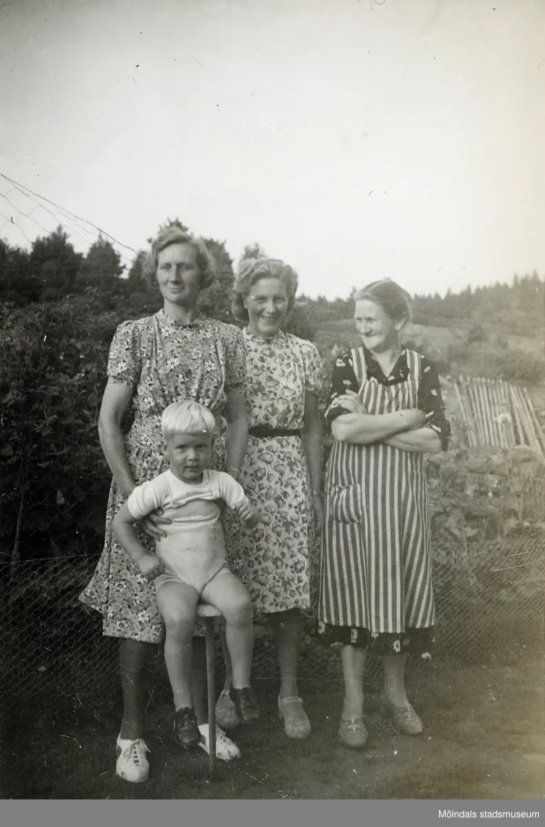 Tre kvinnor står och en liten pojke sitter på en pall framför en åker, troligtvis i Lindome, okänt årtal. Bilder ur fotoalbum från Aina Englund som växte upp i en jordbrukarfamilj i Lindome. Relaterade motiv: 2024_1542 - 1617.