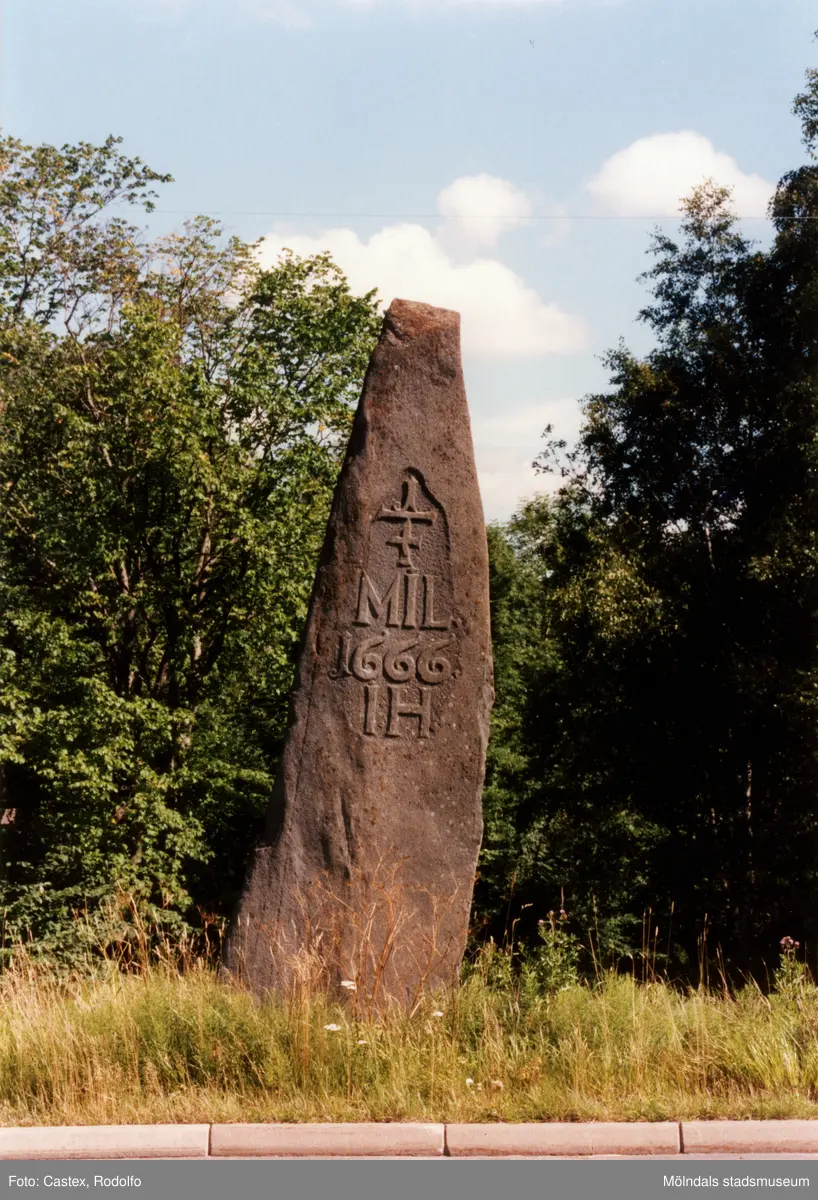 Milstenen intill Östra Lindomevägen i Annestorp, Lindome, juli-augusti 1998.