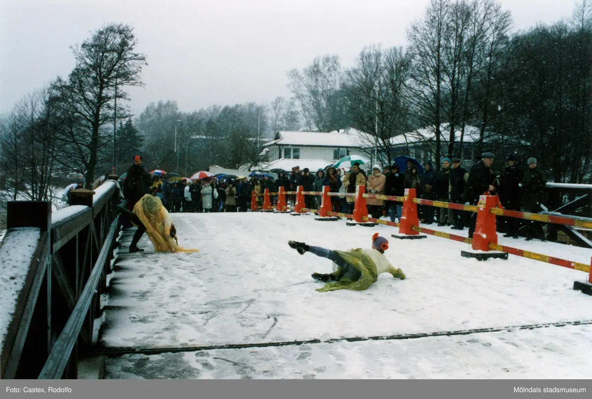 Dansuppvisning vid invigningen av Gunnebo Bro vid Stensjön. Mölndal i mars 1999.